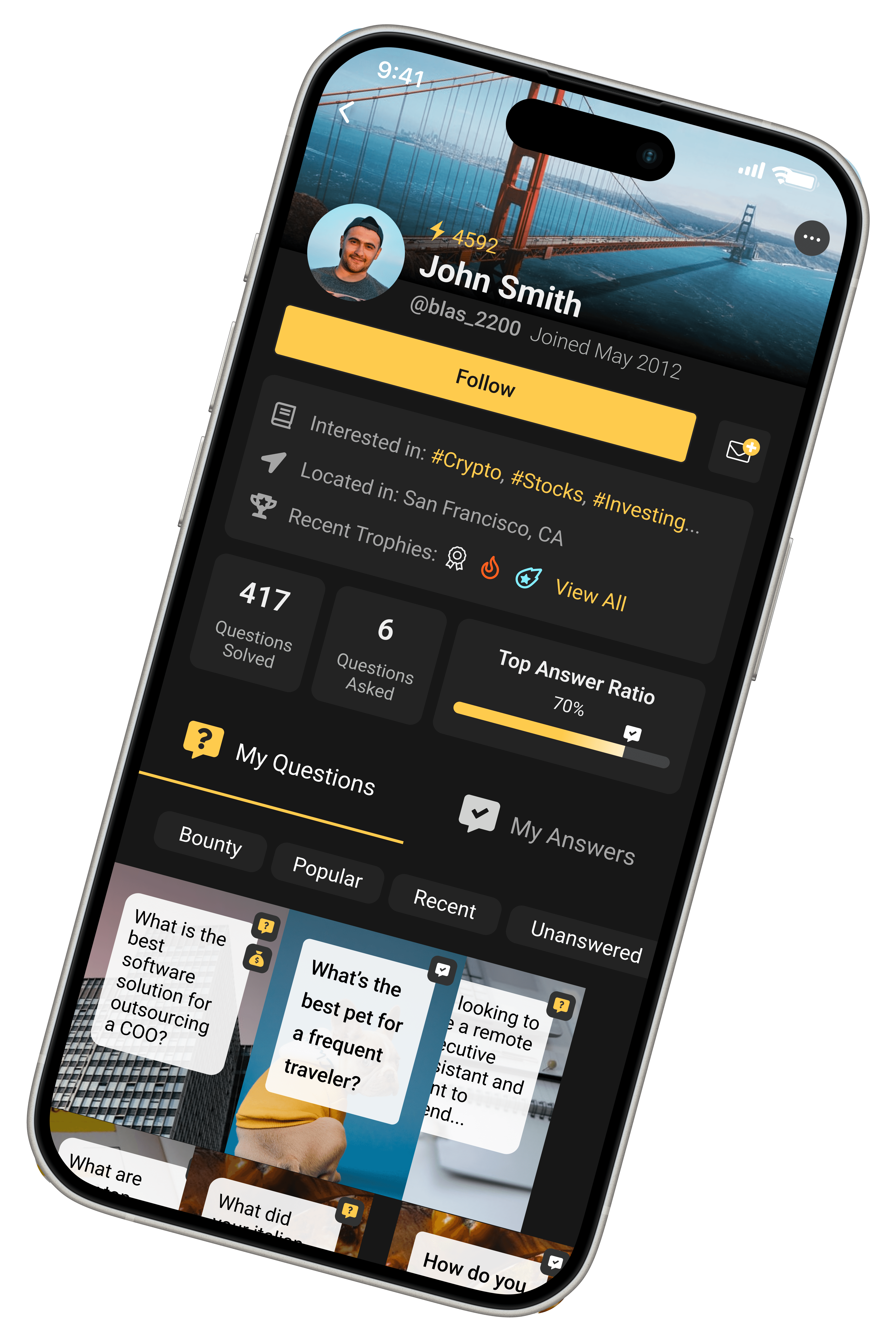 On the profile screen, users can see a visual representation of their engagement history, including statistics about questions they've asked and answered. There are also achievement indicators to gamify participation and included simple settings for customization.